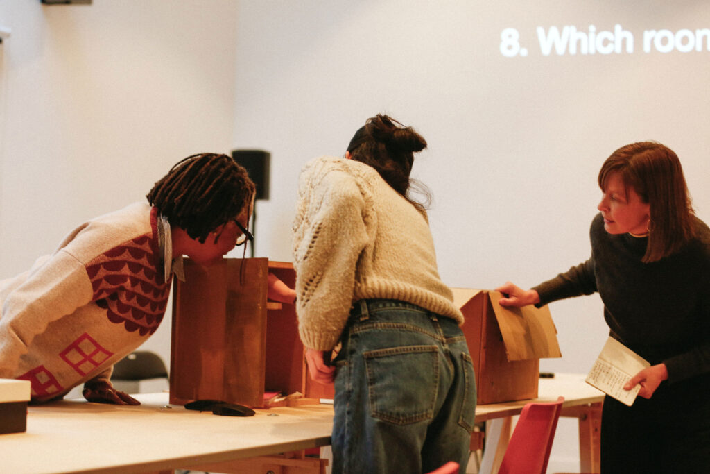 In the space next to Telescope at Museum Gunzenhauser, we also created an installation called Moving Boxes. It was an invitation to make, reshape, and build with cardboard boxes, in response to a changing series of prompts – to shape walls, pyramids, cities, that were each day broken down to start again and be remade the next day. This installation remains, and continues until 18 January 2026, alongside the archive of objects from Telescope in the gallery next door.